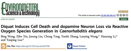 近日,hy3380cc海洋之神骆焱平教授、王兰英教授与环境科学与工程公司李汉增教授在环境领域期刊Environmental Science & Technology发表题为“Diquat induces cell death and dopamine neuron loss via reactive oxygen species (ROS) generation in Caenorhabditis elegans”的研究论文。其中,团队成员王兵为论文的第一作者,骆焱平教授、李汉增教授和王兰英教授为论文的通讯作者。