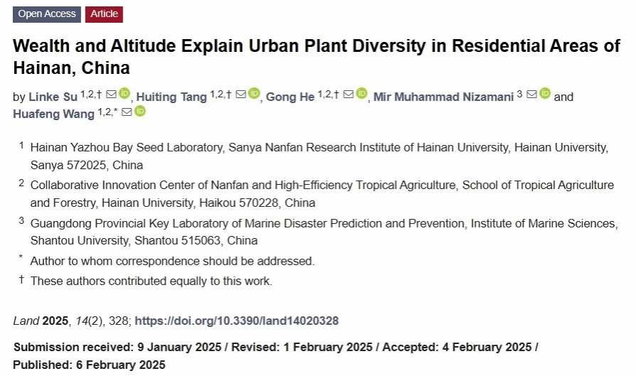 2025年2月,《Land》期刊(中科院二区期刊,IF=3.2)发表题为“Wealth and Altitude Explain Urban Plant Diversity in Residential Areas of Hainan, China”的研究论文。hy3380cc海洋之神本科生苏琳珂为该论文的第一作者,王华锋教授为论文的通讯作者。本研究得到国家自然科学基金的资助。
