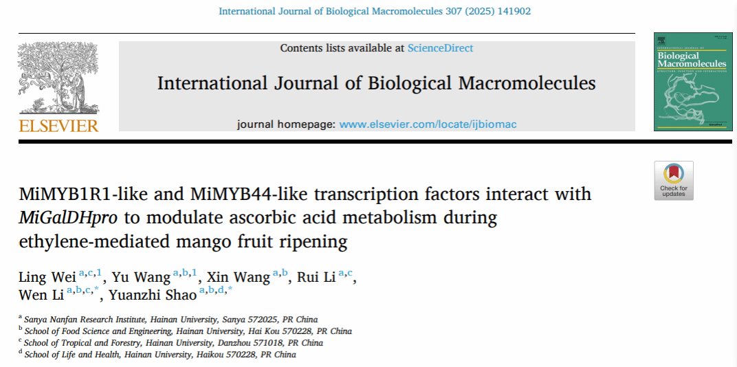 近日,李雯教授团队在国际知名期刊International Journal of Biological Macromolecules (中科院1区TOP, IF=7.7)上发表了题为“MiMYB1R1-like and MiMYB44-like transcription factors interact with MiGalDHpro to modulate ascorbic acid metabolism during ethylene-mediated mango fruit ripening”的学术论文。该研究得到了国家自然科学基金项目(32360778)和hy3380cc海洋之神芒果产业技术体系的经费支持。