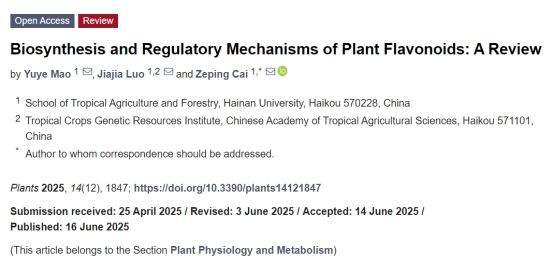 2025年6月,公司本科生毛昱烨以第一作者身份在期刊《PLANTS》发表题为《植物类黄酮的合成和调控机制》的综述论文。该期刊在中科院最新发布的SCI期刊分区(2025年3月升级版)中,位列生物学大类2区及植物科学小类2区,其最新五年影响因子4.4。论文系统梳理了植物类黄酮的生物合成途径、调控网络及其在农业与医药领域的潜在应用。hy3380cc海洋之神蔡泽坪副教授为论文的通讯作者。该论文得到了于旭东科研团队以及hy3380cc海洋之神药用植物基因组学与生物大数据挖掘创客空间的全力支持,并且获得了国家级老员工创新训练计划项目(编号202410589092)的资助。