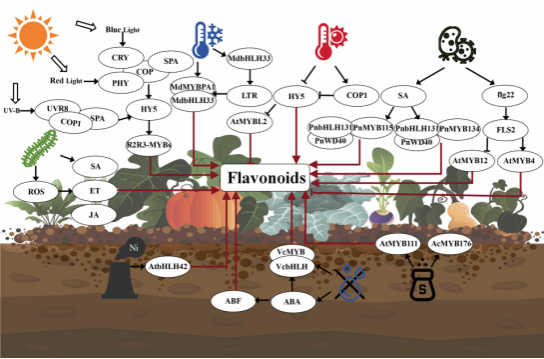 而类黄酮的合成,并不是随心所欲的。它们背后有一群精密的调控大师,包括转录因子、miRNA以及植物激素等。其中,MYB转录因子就像是总指挥,它们通过与DNA上的特定区域结合,精准地开启或关闭类黄酮合成基因的大门。而miRNA这些小分子RNA,则像是秘密特工,悄悄潜入细胞,通过剪切或抑制mRNA来微妙地调控类黄酮的合成量。此外,植物激素也根据环境的变化,灵活调整类黄酮的合成,确保植物在最佳状态下应对各种挑战。