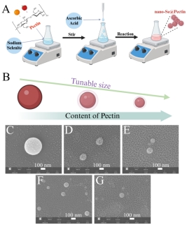 为了改善纳米硒的贮藏稳定性和进一步提高其生物活性,通过使用天然高分子聚合物——果胶(Pectin)对纳米硒改性以合成不同果胶含量(0.1%、0.5%、1%、2%)的果胶纳米硒(nano-Se@PT)。Nano-Se@PT具有更加优良的生物活性和贮藏稳定性,作用效果随着果胶含量的增加而提升。随着果胶含量增加,nano-Se@PT粒径减小、Zeta电位值升高、热重分解温度升高,且在40℃和70℃条件下贮藏稳定性显著提升。