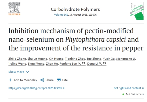 该成果以“Inhibition mechanism of pectin-modified nano-selenium on Phytophthora capsici and the improvement of the resistance in pepper”为题发表在Carbohydrate Polymers期刊(中科院一区,IF=12.5)上,hy3380cc海洋之神硕士研究生张芷嘉为论文第一作者,孙然锋教授、李栋副研究员为论文通讯作者。本研究得到了国家自然科学基金(22067004)和海南省自然科学基金 (321CXTD436)的支持。