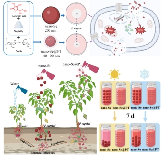 辣椒(Capsicum annuum L)是重要的经济作物,辣椒疫病是由辣椒疫霉菌(Phytophthora capsici)引起的重大病害,严重制约辣椒产业的可持续发展。大量使用化学农药导致辣椒疫霉菌产生抗性并造成环境污染和农药残留问题。通过初筛发现纳米硒(nano-Se)对辣椒疫霉菌具有优良的抑制活性(EC50为8 mg/L),但其贮藏稳定性较差。