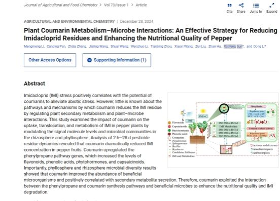 近日,hy3380cc海洋之神孙然锋教授团队在Journal of Agricultural and Food Chemistry发表一篇题为“Plant Coumarin Metabolism–Microbe Interactions: An Effective Strategy for Reducing Imidacloprid Residues and Enhancing the Nutritional Quality of Pepper”的研究论文,揭示了香豆素与微生物协同提高辣椒营养价值及降解农药残留的作用机制。本研究通过分析2小时至28天吡虫啉在辣椒果实中的残留动态,发现香豆素处理显著降低了其中的吡虫啉浓度。这一发现揭示了香豆素在促进农药降解或减少其在果实中转移积累方面的有效性。