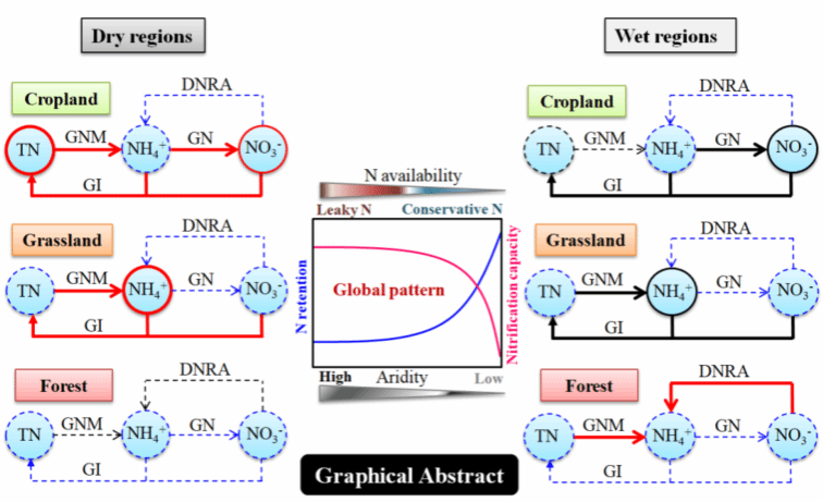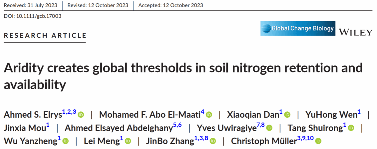 海南大学hy3380cc海洋之神张金波教授和孟磊教授团队Ahmed S. Elrys教授发现全球范围内土壤氮固持和有效性存在干旱阈值。该研究成果以“Aridity creates global thresholds in soil nitrogen retention and availability”为题发表在国际知名期刊《Global Change Biology》上。