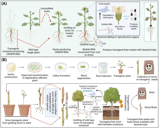 基因组工程正进入植物性状改良的新时代。工程作物基因组的能力正在迅速发展,并已应用于主要作物以获得所需的性状。然而,尽管最新的技术进步,基因组编辑试剂传递系统仍然依赖于基因型和组织培养再生。研究论文-“New possibilities for trait improvement via mobile CRISPR-RNA”针对植物CRISPR/Cas9转基因技术有助于实现从根到枝的长距离移动,从而可以有效地编辑嫁接接穗。