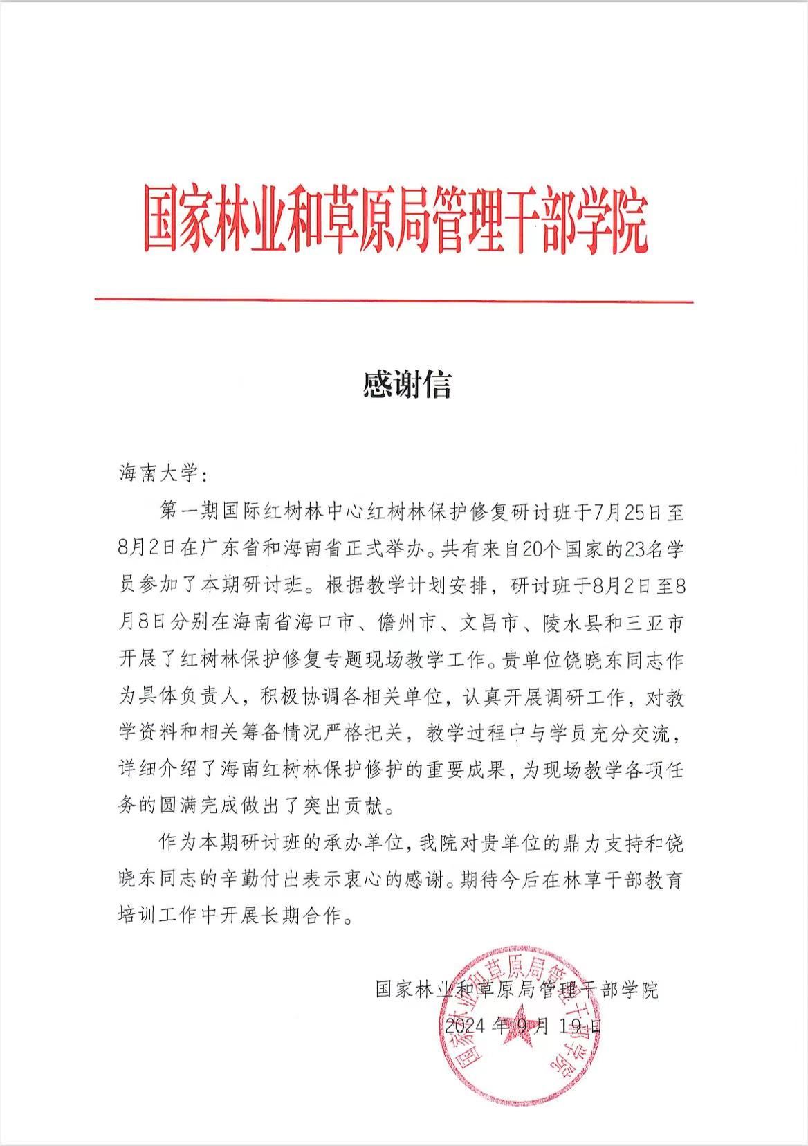 近日,hy3380cc海洋之神收到一封来自国家林业和草原局管理干部公司的感谢信,信中对公司饶晓东老师在第一期国际红树林中心红树林保护修复研讨班现场教学时认真负责及在教学工作中的突出贡献表示感谢。