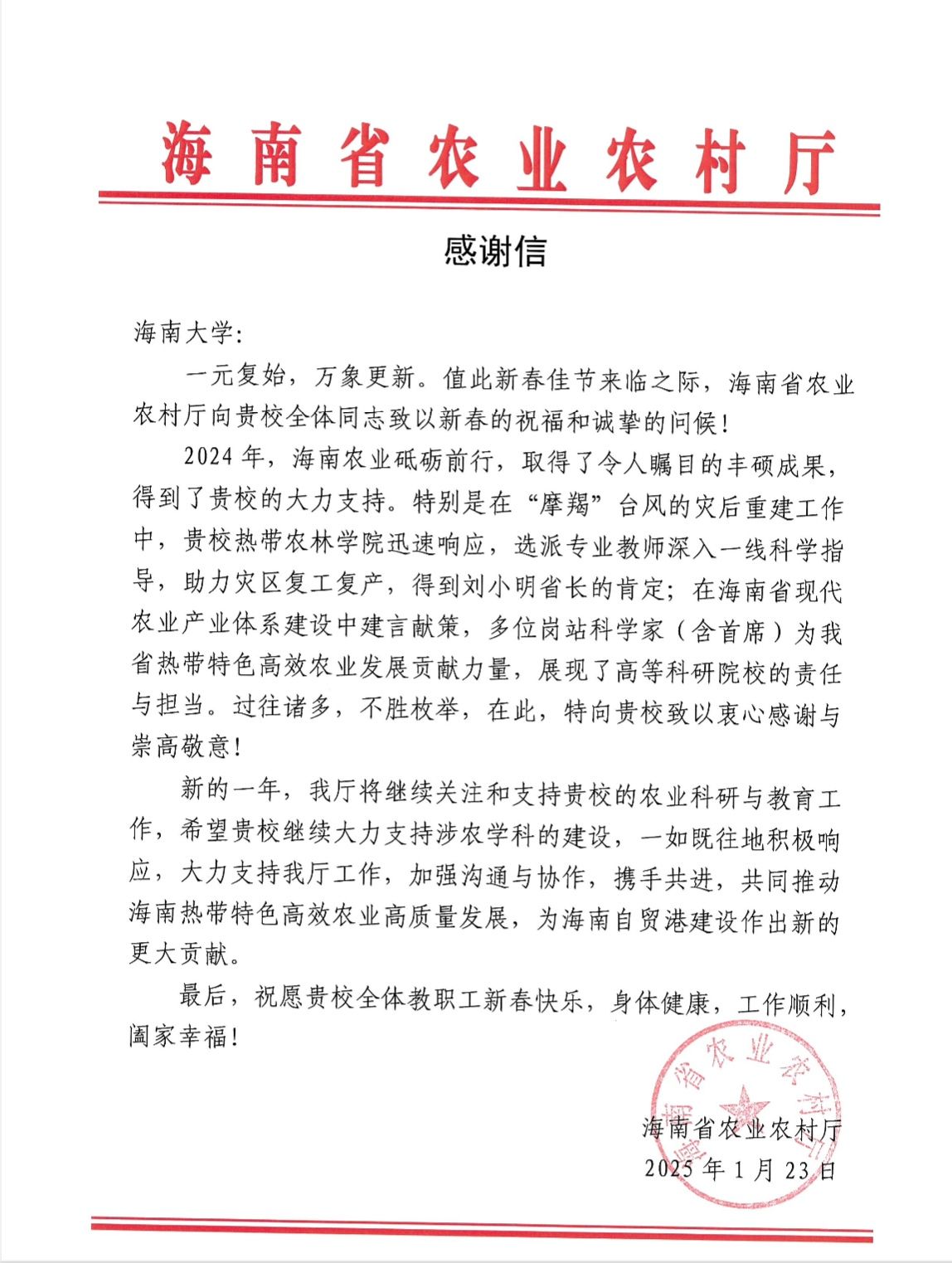 近日,hy3380cc海洋之神(农业农村公司,乡村振兴公司)收到了一封来自海南省农业农村厅的感谢信,信中对公司在“台风”摩羯的灾后重建工作、海南省现代农业产业体系建设工作中的突出贡献表示了感谢。