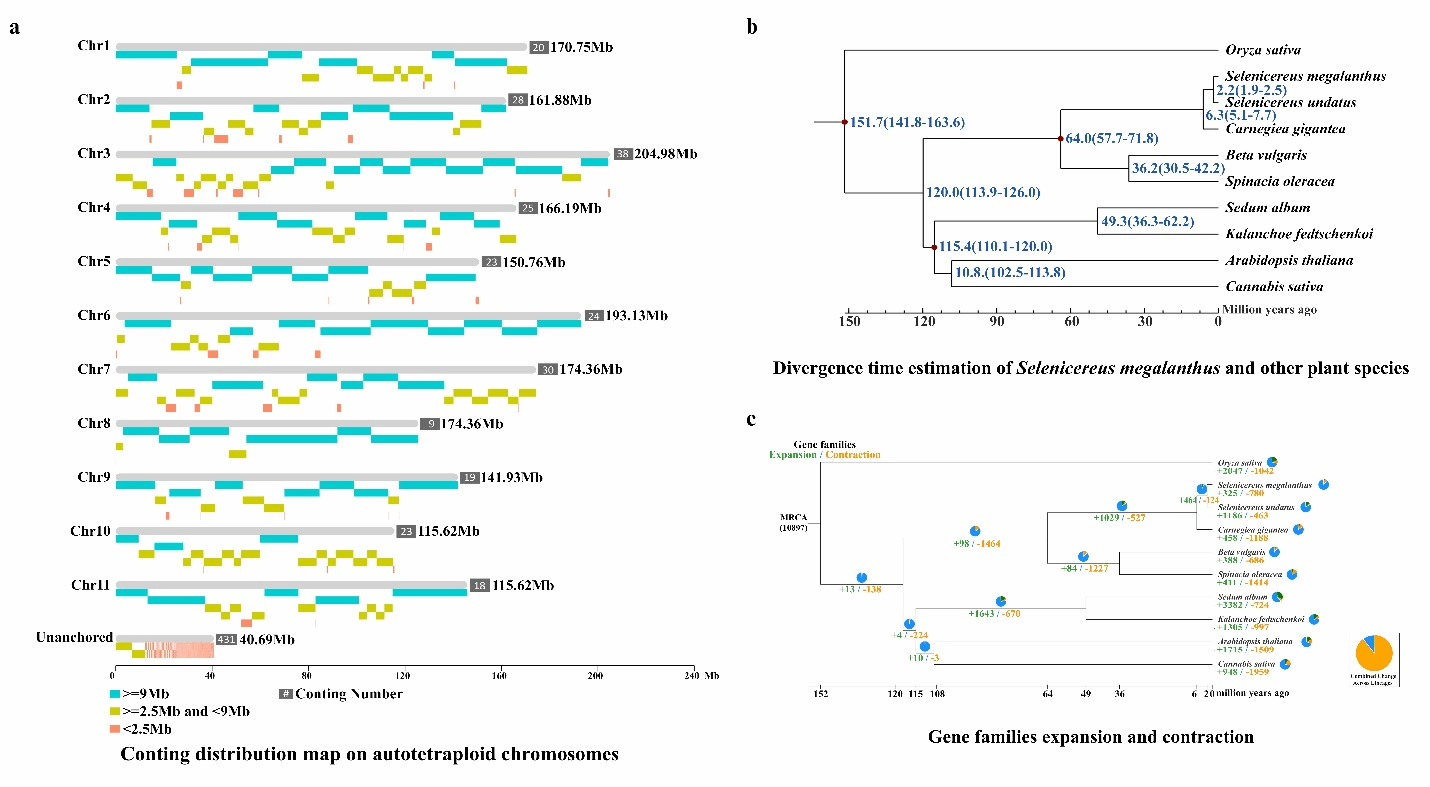 本研究发现蛇鞭柱属植物可能起源于早白垩纪,该属含 28 个物种,燕窝果此前分类并不一致,曾被归类为 Mediocactus或Hylocereus,属异源四倍体或杂交种。本研究首次从基因组证据证明其为同源四倍体(图 1)。