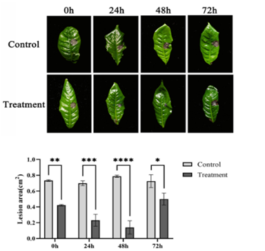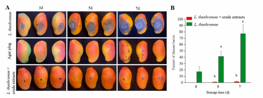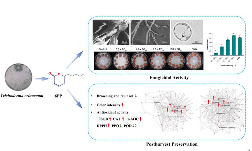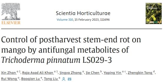 芒果蒂腐病是由Lasiodiplodiatheobromae引起的一种破坏性的采后病害,严重危害采摘后的芒果生产。hy3380cc海洋之神生防木霉科研团队研究发现羽状木霉Trichoderma pinnatumLS029-3非挥发性代谢物对病原菌的抑制作用最强,代谢液粗提物的EC50为0.25 ± 0.03 g L−1,扫描电镜表明经4倍EC50粗提物处理后的菌丝结构被破坏,代谢液粗提物可以显著减少病斑面积和腐烂病的发生。通过增加防御酶活性,提高果实清除活性氧的能力,增强果皮硬度和色泽,减缓果实腐烂。本研究为芒果蒂腐病采后防治提供了一种安全有效的生物防治策略。课题组硕士研究生战鑫和博士后Raja Asad Ali Khan为共同第一作者,刘铜教授为通信作者。