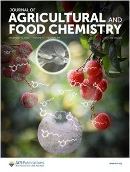 荔枝霜疫病是目前荔枝生产及贮运过程中非常严重的病害,贮运期间只要有少数几个果实携带病菌便可使附近果实全部发病,从而导致大量果实腐烂变质,造成严重经济损失。海南老员工防木霉课题组研究发现猬木霉LS019-2对荔枝霜疫霉菌丝生长抑制率最高,其中挥发性化合物6-戊基-2H-吡喃-2-酮(6PP)为主要抑菌物质,6PP显著抑制荔枝霜疫霉菌丝生长、孢子囊萌发、严重破坏菌丝体的超微结构,阻碍病害的发展。同时,在保鲜过程中能保持较好的果皮色泽、增强抗氧化物酶活性、富集氨基酸、减缓失重,从而延长了荔枝的货架期。因此,天然挥发性物质6PP既可以作为杀菌剂同时也是一种新型果实防腐保鲜剂用于荔枝的生产中。该论文为Journal of Agricultural and Food Chemistry封面文章(2023, Volume 71)。课题组邢梦玉副教授和赵晶讲师为共同第一作者,刘铜教授为通信作者。