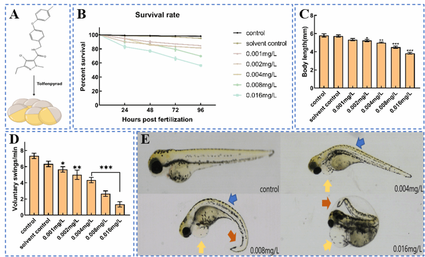 Figure 3 Tolfenpyrad induces embryonic developmental toxicity in zebrafish. (A) Schematic diagram of zebrafish acute toxicity testing.