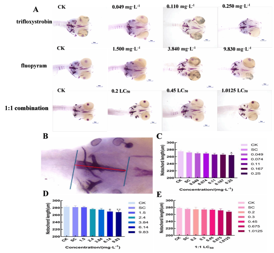 Figure 2 Effects of trifloxystrobin, fluopyram alone and 1:1 combination on zebrafish craniofacial bones (7d)