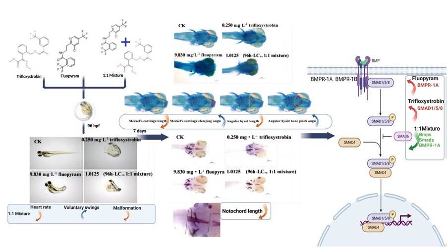 Trifloxystrobin (TRI) 是一种甲基丙烯酸酯类杀菌剂,而 Fluopyram (FLU) 则是一种新型吡啶乙基苯甲酰胺类杀菌剂和杀线虫剂。这两种杀虫剂经常在水体中被检测到,可能对许多水生生物有剧毒。遗憾的是,目前还没有关于单一 FLU 或肟菌酯与氟吡菌酰胺混合物的水生生物风险的报道。本研究选择斑马鱼作为试验生物,研究肟菌酯和氟吡菌酰胺对斑马鱼的联合毒性。斑马鱼胚胎接触三种农药溶液后,分别进行了阿尔新蓝染色、茜素红染色和定量 PCR(qPCR)。结果表明,TRI 对斑马鱼胚胎的 96h-LC50 为 0.159 mg·L-1,高毒。FLU 对斑马鱼胚胎的 96h-LC50 为 4.375 mg·L-1,属中毒。 对斑马鱼胚胎的联合毒性(FLU 的 96h-LC50 和 TRI 的 96h-LC50 以 1:1 的重量比组成一系列浓度处理组)是拮抗的。肟菌酯和氟吡菌酰胺对斑马鱼的骨骼发育也有抑制作用,并显示出拮抗作用。qPCR 的结果表明,在三种不同的处理方式下,不同的基因都出现了上调。TRI 主要诱导 Smads 的上调表达,这可能会影响 BMP-smads 通路。FLU 主要诱导细胞外 BMP 配体和 I 型受体(Bmpr-1a)的上调表达,这可能会影响 BMP 配体受体途径。肟菌酯和氟吡菌酰胺 1:1 的混合物(重量比)诱导细胞外 BMP 配体,Smads和 I 型受体(Bmpr1ba)基因的减少,这可能会下调 BMP 信号,减少诱导软骨过度增殖、肥大和矿化。这些结果激发了进一步研究这两种杀真菌剂混合物对斑马鱼影响的兴趣。