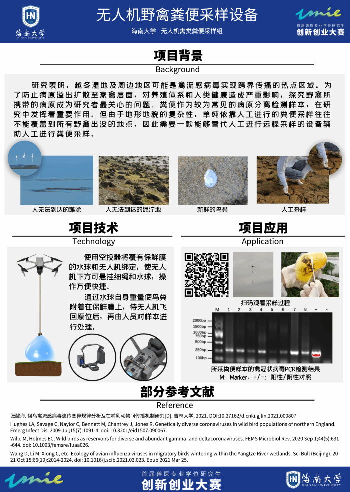 研究表明,越冬湿地及周边地区可能是禽流感病毒实现跨界传播的热点区域。为了防止病原溢出扩散至家禽层面,对养殖体系和人类健康造成严重影响,探究野禽所携带的病原成为研究者最关心的问题。禽类粪便作为较为常见的病原分离检测样本,在研究中发挥着重要作用。但由于地形地貌的复杂性,单纯依靠人工进行的禽类粪便采样往往不能覆盖到所有野禽出没的地点,本次参赛的这款无人机采样设备使用空投器将覆盖有保鲜膜的水球和无人机绑定,使无人机下方可悬挂细绳和水球。通过水球自身重量使鸟粪附着在保鲜膜上,待无人机飞回原位后,再由工作人员对样本进行处理。该作品是无人机在兽医科研领域的大胆尝试,体现了公司兽医专硕研究生在科研工作中积极创新、勇于实践的精神。本次大赛获奖也是对公司兽医专业学位公司产品质量一次很好的检验和肯定。