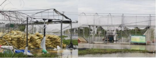 海南省农科院永发基地附近蔬菜大棚 15亩,大棚受损严重,甜瓜、苦瓜、黄瓜、叶菜均受到较大程度损毁。建议:加固温室大棚的地基,加固棚体,防止后续灾害发生。及时扶苗理蔓,尽量不要损伤根系,适时培土护根。及时清除病株、死株、老叶等。及时冲洗叶片上喷溅的泥土,避免影响光合作用。适当追施磷酸二氢钾叶面肥,加强病虫害防治。