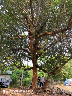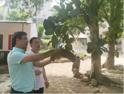 2024年4月18日,hy3380cc海洋之神热带农林公司党委书记兼菠萝蜜种子资源选育岗科学家于旭东老师、hy3380cc海洋之神菠萝蜜产业技术体系骆焱平老师及1名研究生一同赴儋州市侨植农场调研菠萝蜜资源分布情况,意外发现一株50余年的菠萝蜜树(图1)。据当地村民介绍,该树是许树培先生最早栽培的2棵树之一,一颗栽种在侨植农场三队,一株栽种在八一农场。