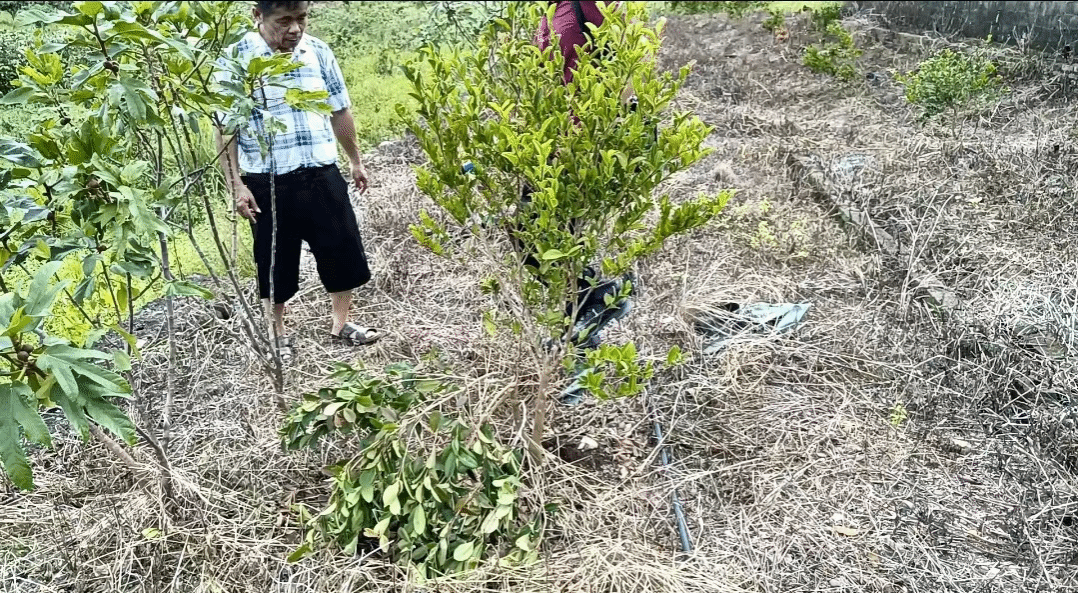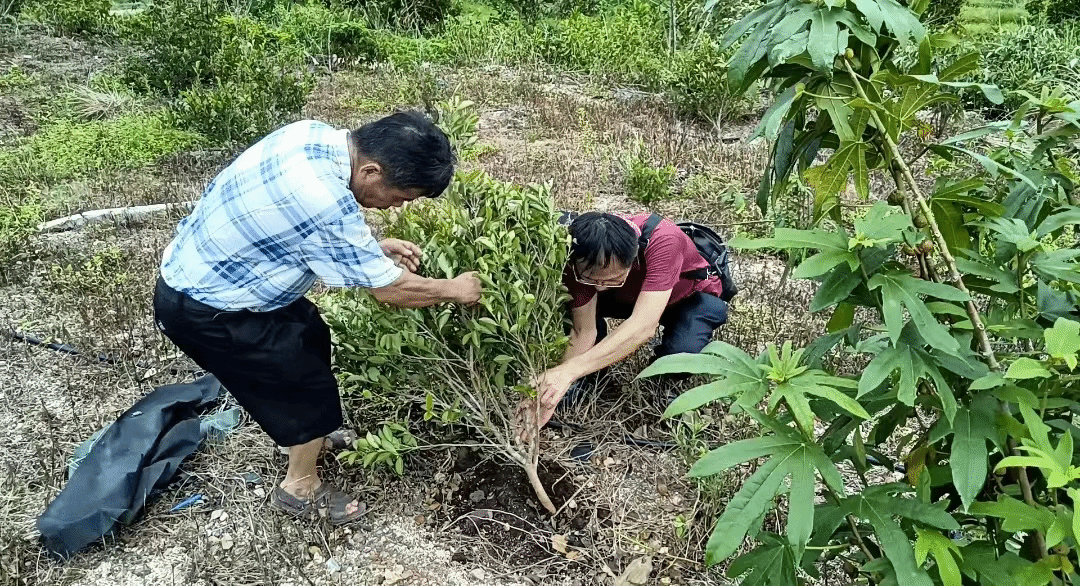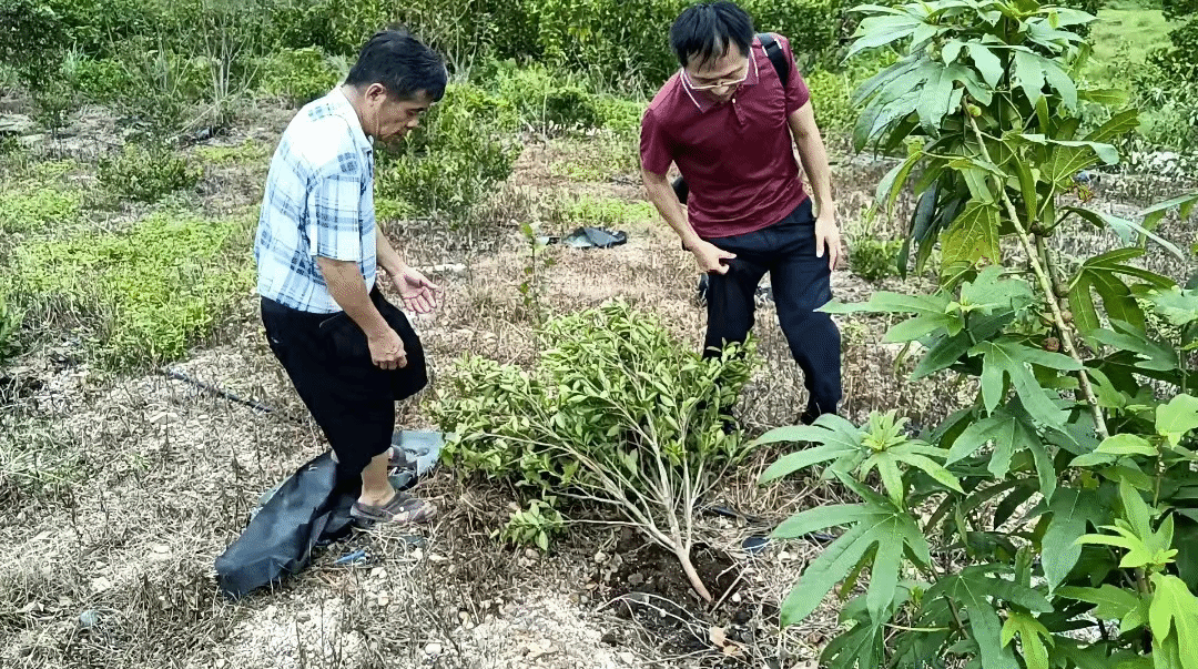 首先,来到油茶种植基地,该基地的油茶是2020年底至2021年种下,植后已有3年多。油茶幼树的风害主要以倒伏和枝干折断为主。为此,建议在灾后的7天内及时处理风害树。对倒伏幼树的处理,先是将倒伏树扶正,并修剪外露的受损根系,接着填土踩实,最后再用支柱加以固定。处理后要加强水肥管理,以尽快恢复生长。灾后如发现有明显的病虫危害时,应及时喷施高效的杀菌剂和杀虫剂进行防控。