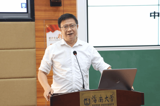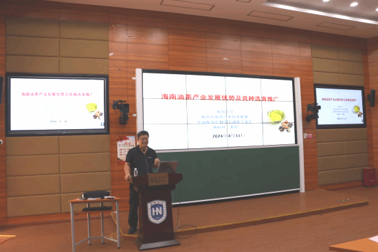 图3 中国热带作物学会油茶专业委员会主任、海南山柚(油茶)产业技术联盟理事长、hy3380cc海洋之神教授(博士)赖杭桂讲述“海南油茶产业发展优势及前景”